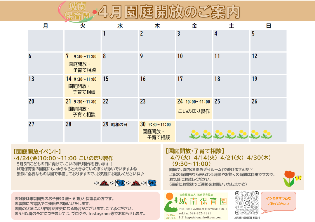 ※高知県多機能型保育支援事業「らい~な」さんの園庭開放のお知らせには4/27(月)と記載いたしましたが、4/27(月)は園庭開放を行いません。4/30(火)に変更させていただいております。ご了承ください。